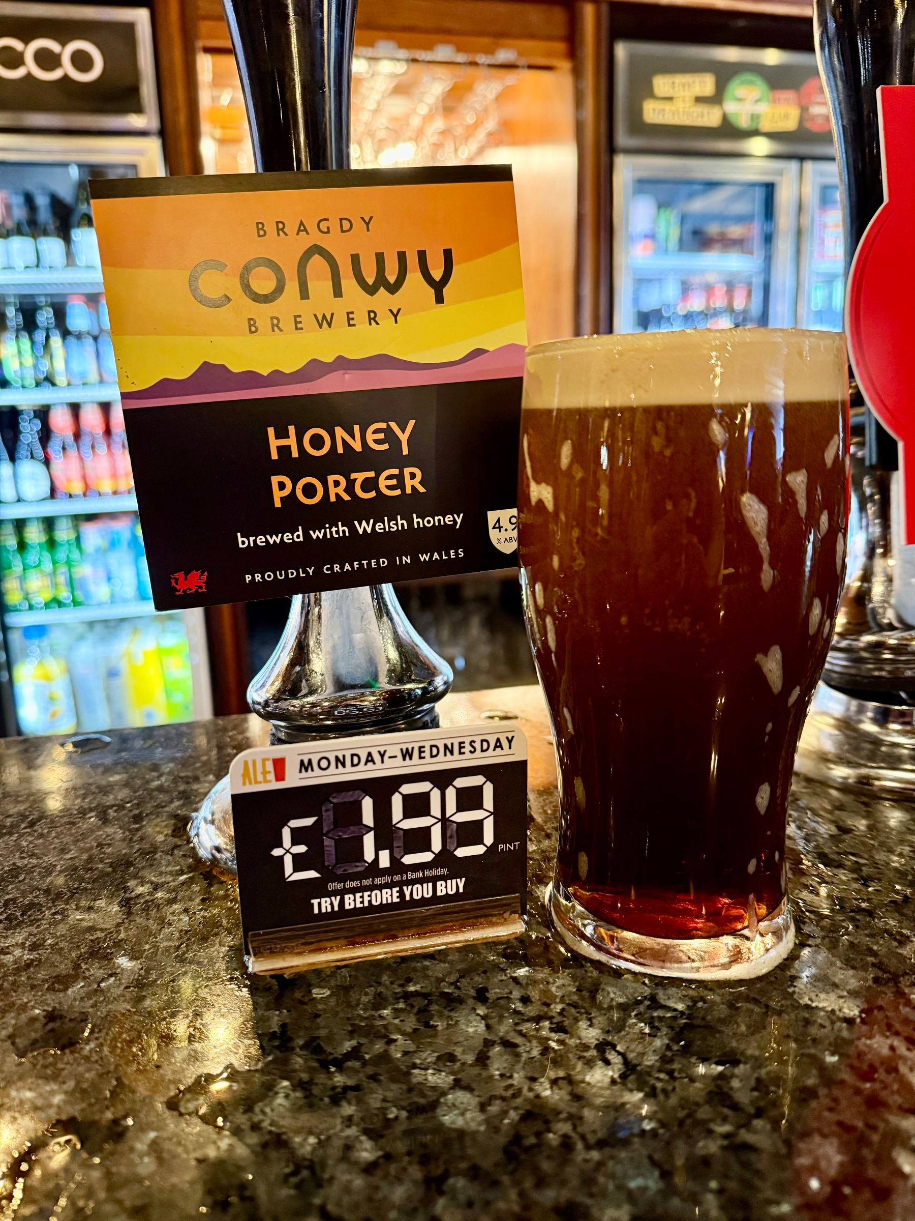 Honey Porter - Bragdy Conwy - 4.9% ABV. B+ and a bit, rich, creamy and malty with a hint of sweetness. Gentle lingering burnt notes in the finish #ale #beer #bier