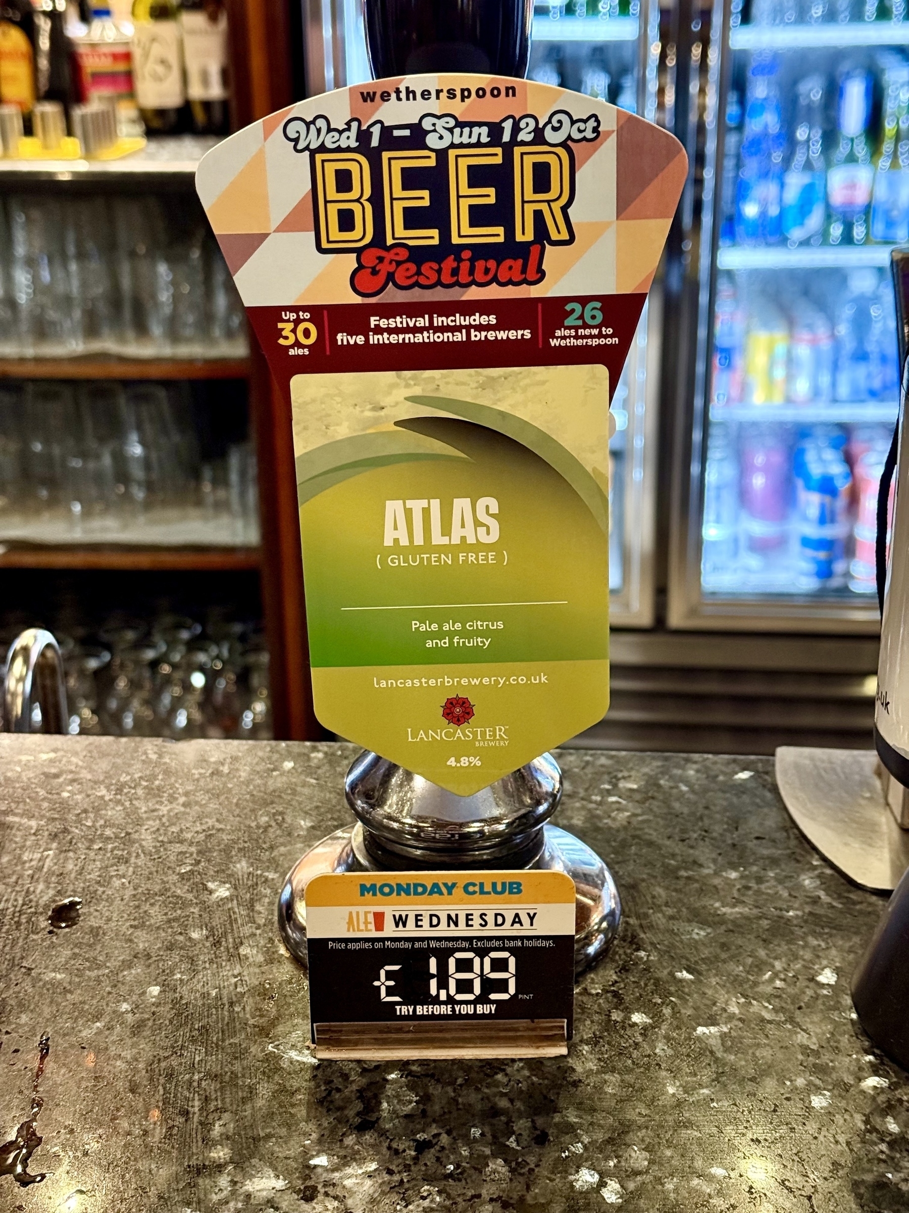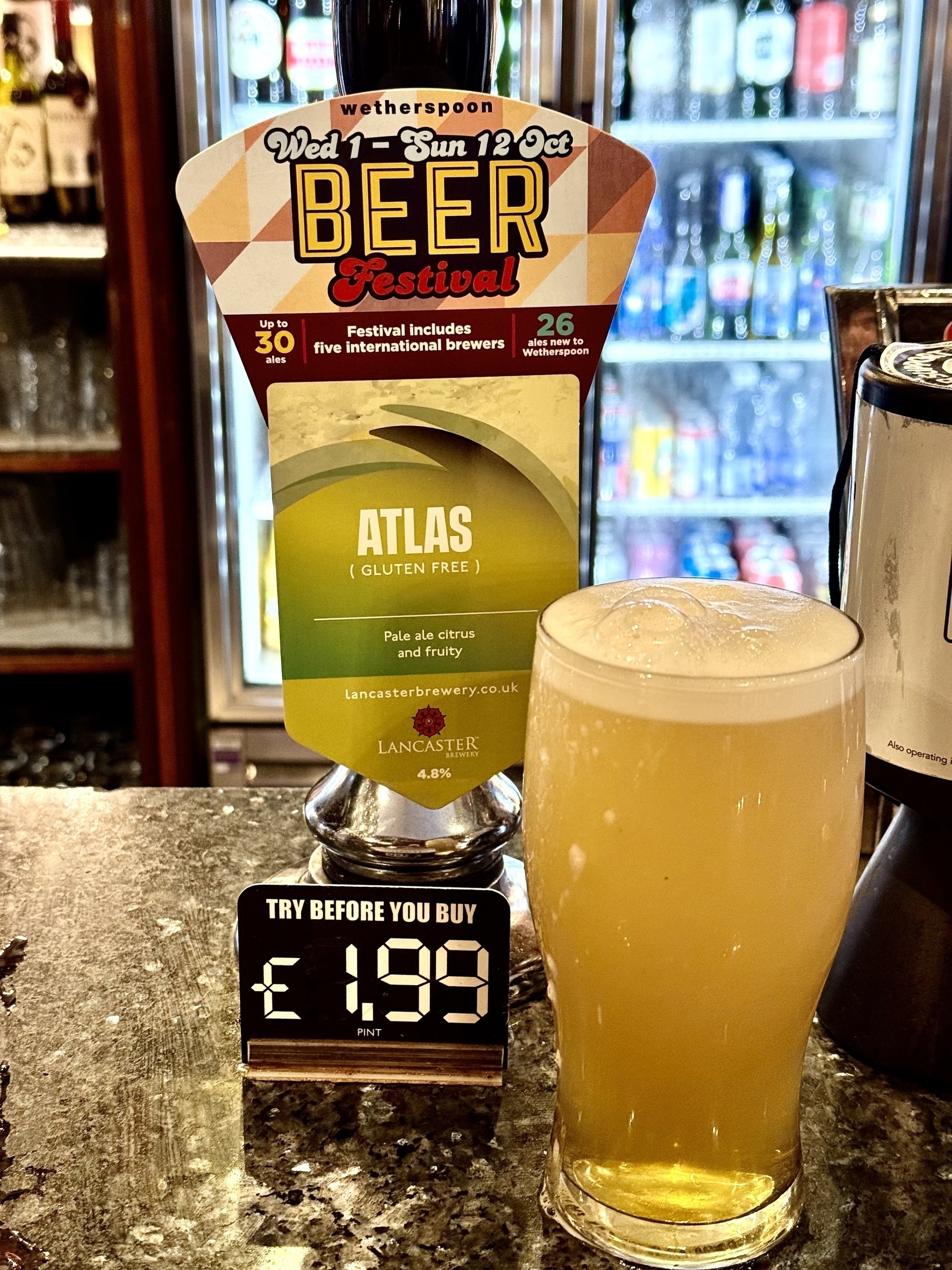 Atlas - Lancaster Brewery - 4.8% ABV. B++, malty base but strong fruity, sharply citrus body. Citrus with a lingering bitter finish #ale #beer #bier