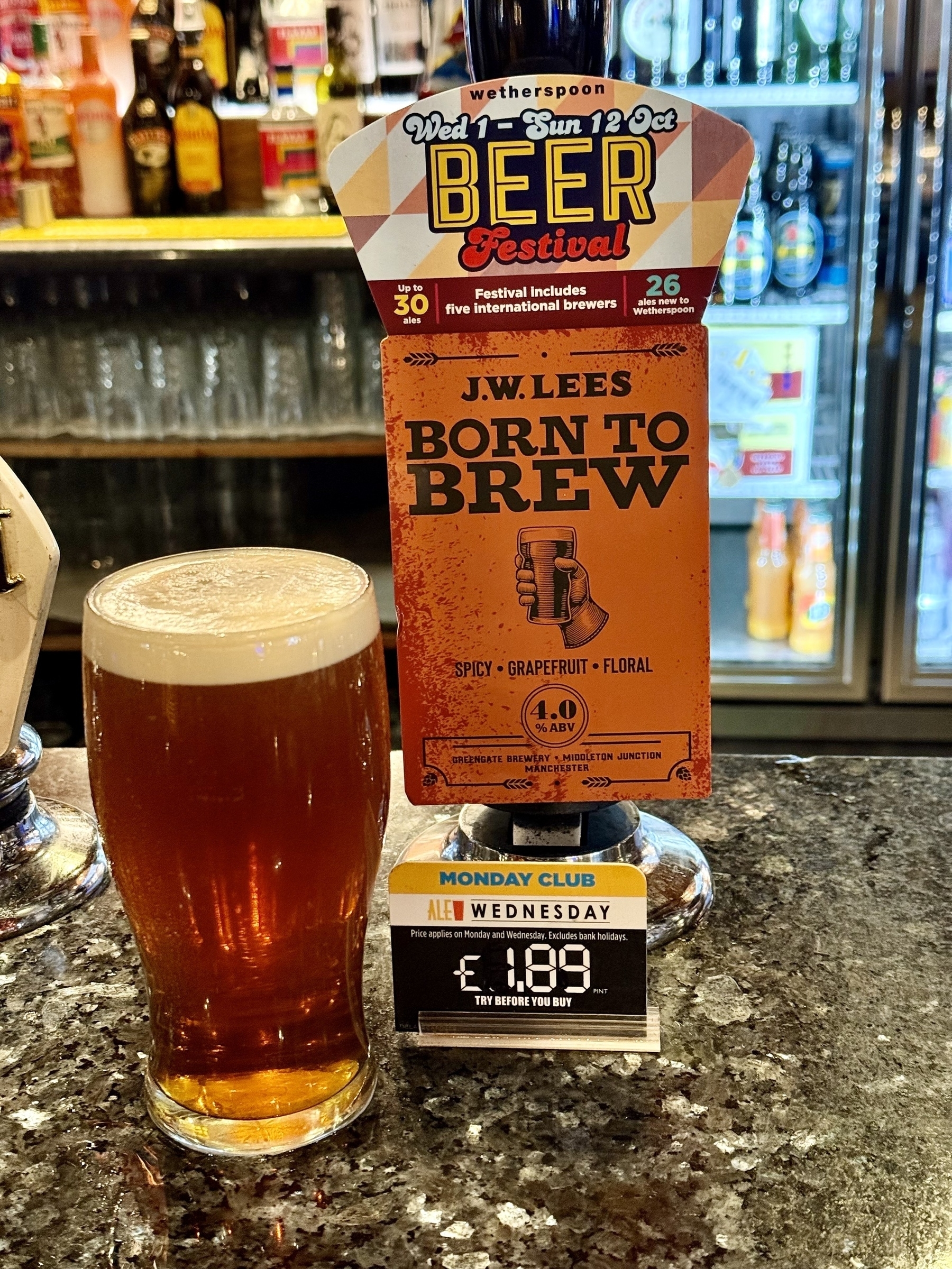 Born to Brew - J W Lees - 4.0% ABV. B++, malty then spicy with hints of citrus and pine. Short, spicy bitter finish #ale #beer #bier