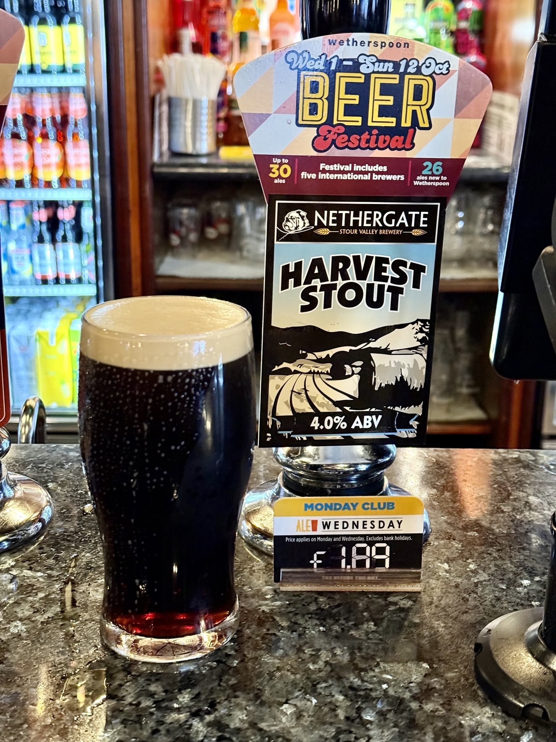 Harvest Stout - Nethergate - 4.0% ABV. B+ and a bit, malty then big fruity, hoppy, chocolate and roasty body. Roasty, fruity bitter finish #ale #beer #bier
