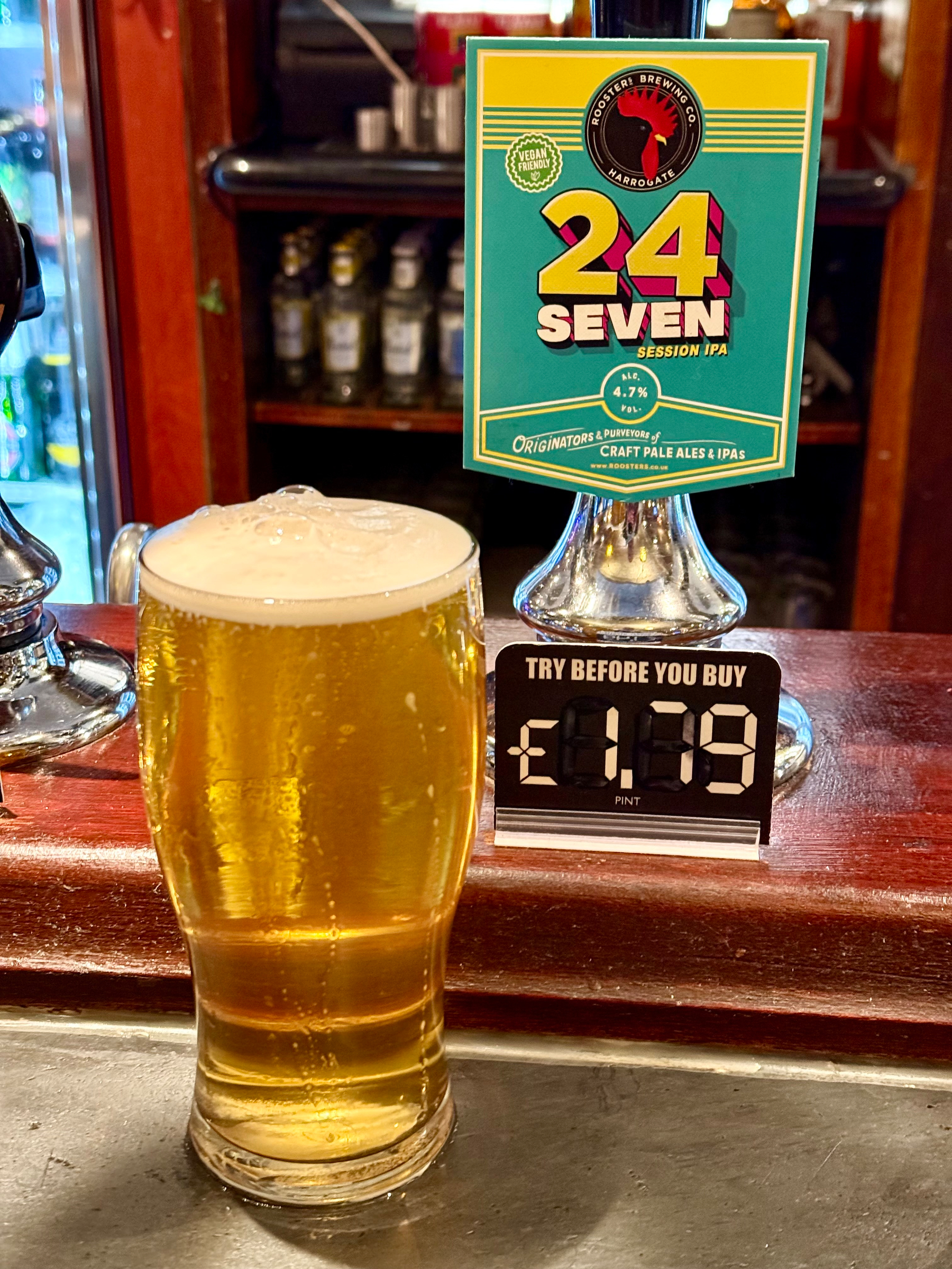 24 Seven - Roosters - 4.7% ABV. B+ and a bit, citrus, grapefruit and piney. Dry, citrus, bitter finish. Decent pint #ale #beer #bier