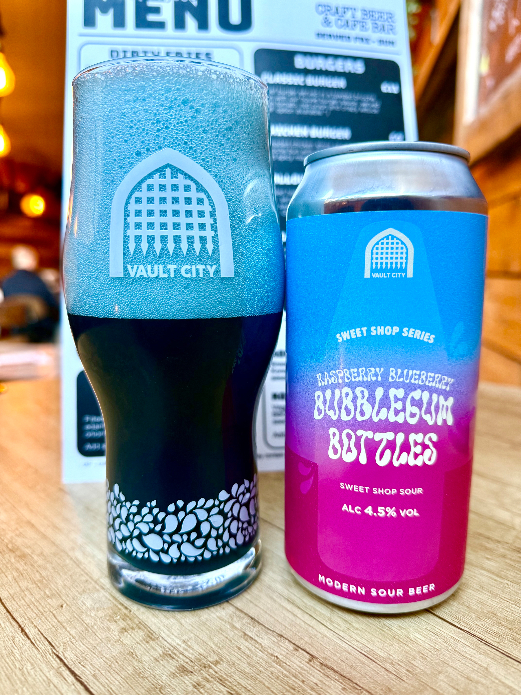 Raspberry Blueberry Bubblegum Bottles - Vault City - 4.5% ABV. B++, sour with a gentle sweetness. Fruity, sherbet with tartness. Tasty Blueness #ale #beer #bier